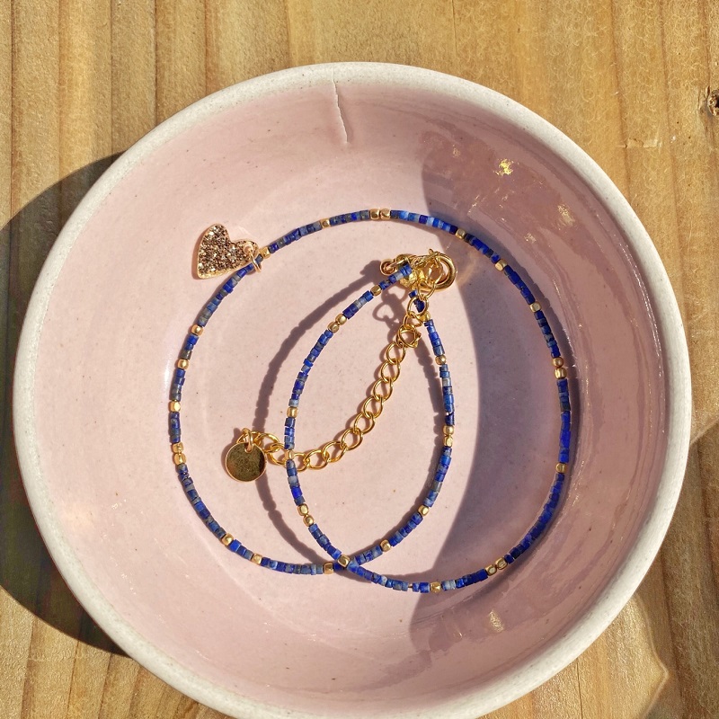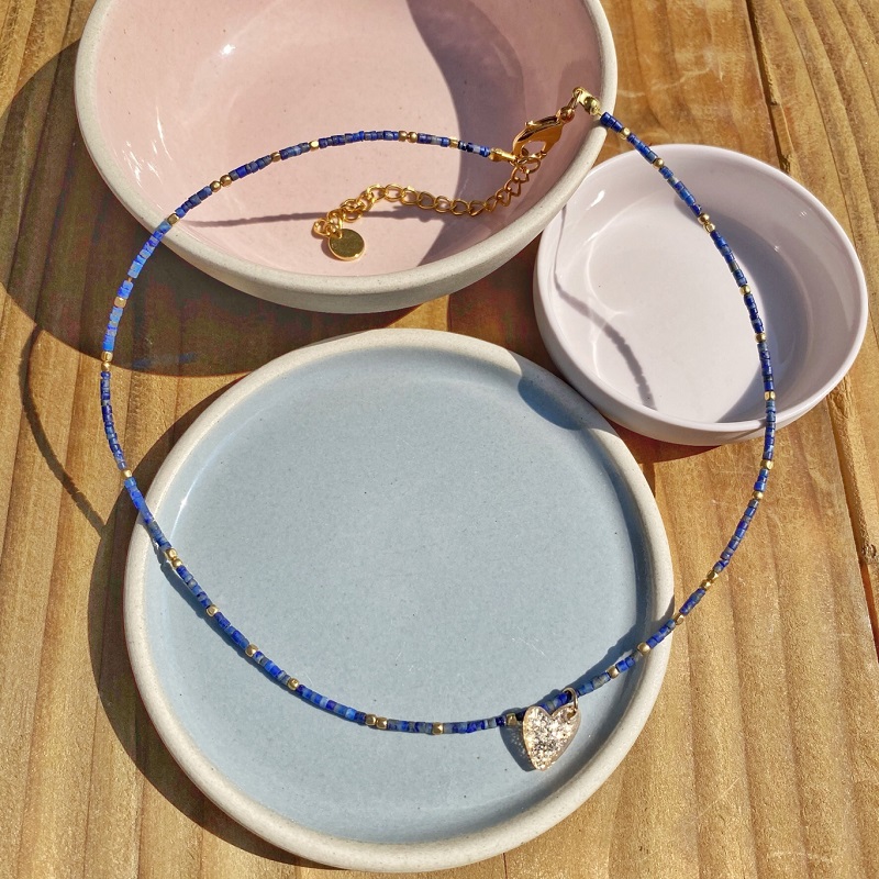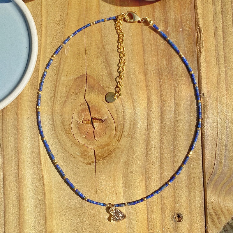 Ce collier fin, mélange de pierres naturelles de lapis lazuli et de petites perles de laiton se porte court mais possède une chaîne de rallonge dorée à l’or fin de 7 cm. Vous pourrez donc l’ajuster à votre convenance. Le joli petit cœur pailleté en acrylique brille de mille feux. Portez le seul ou en accumulation avec d’autres colliers de différentes longueurs.
