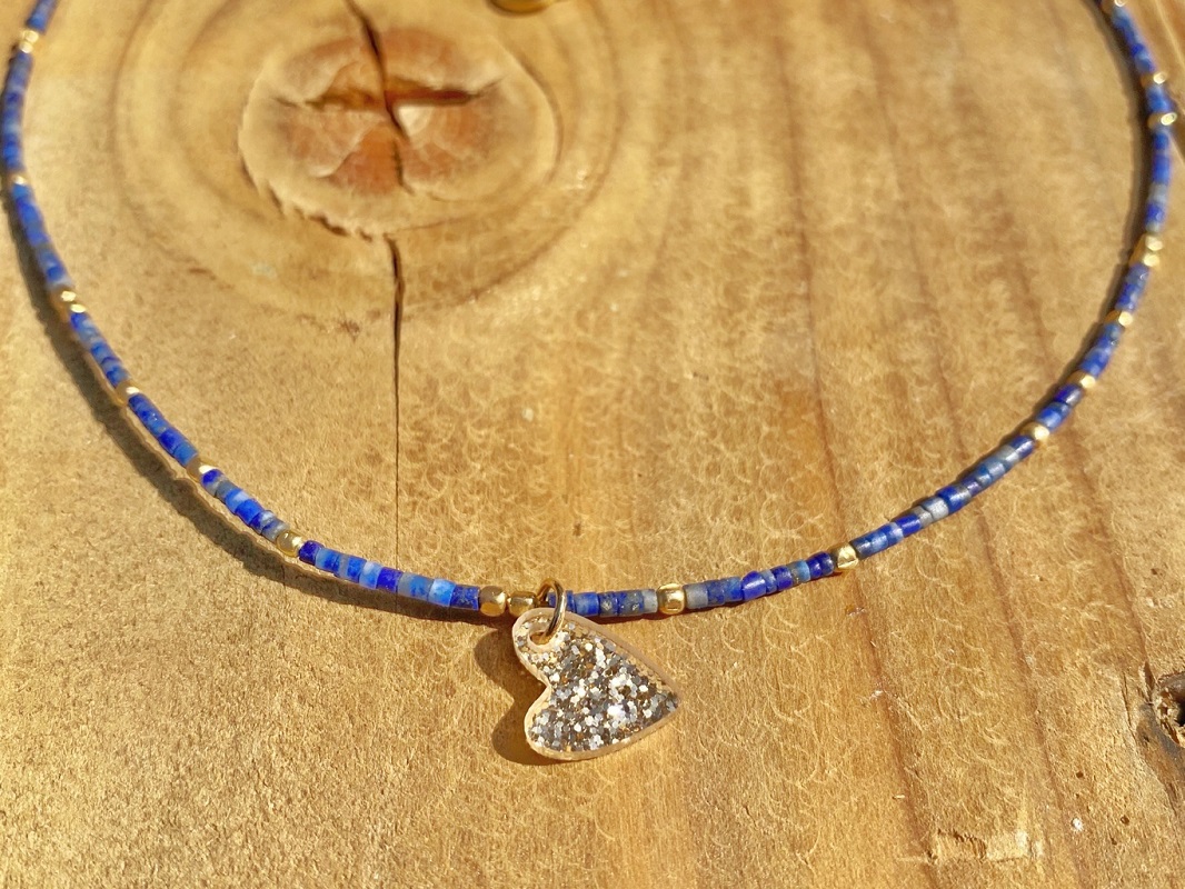 Voici le collier court Beauty Heart en perles de lapis lazuli. J’y ai ajouté des petites perles de laiton pour apporter de l’éclat. Le pendentif cœur en plexiglas pailleté se pose juste au creux du cou pour un joli effet. Le fermoir et la chaine de rallonge sont dorés à l’or fin.