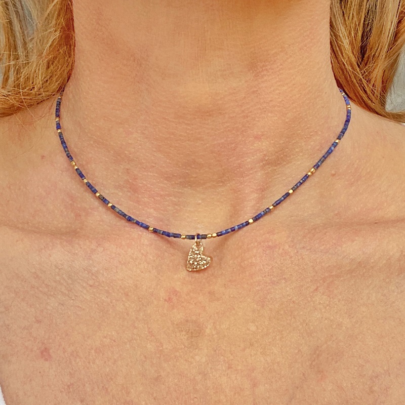 Collier court Beauty Heart en perles de lapis lazuli et laiton.